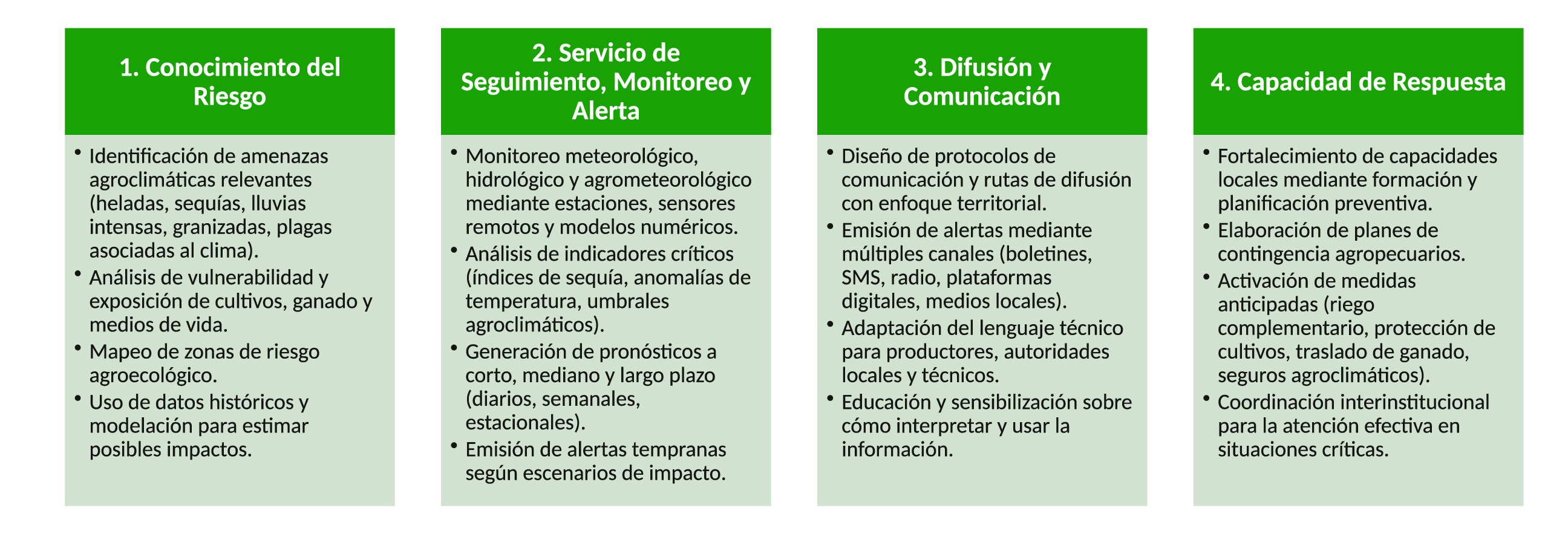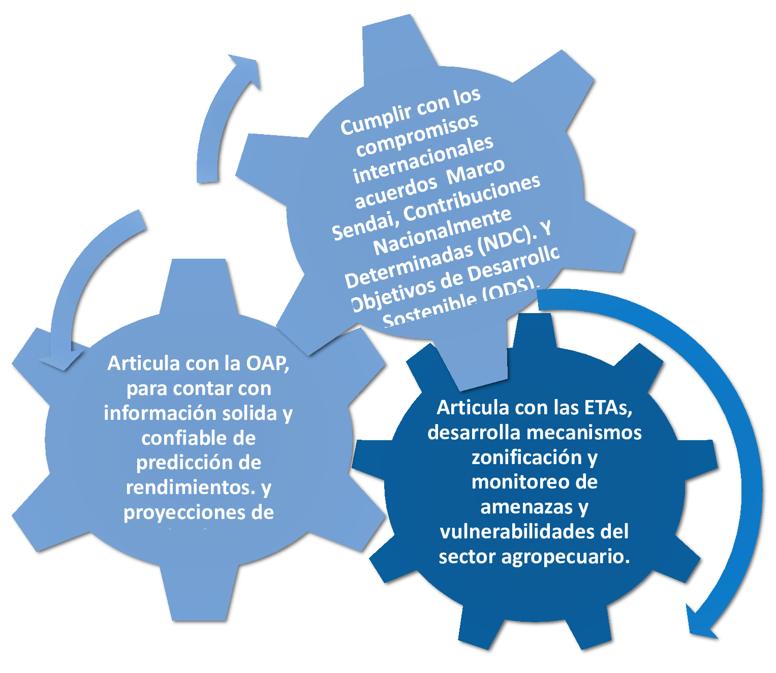 Recuperación Y rehabilitación del sector antes situaciones de desastre. - Proveer información de Servicios Climáticos, actualizados contextualizados y oportunos al sector agropecuario, además medidas para Gestión de Riesgos de perdidas y medidas de adaptación de los sistemas productivos.